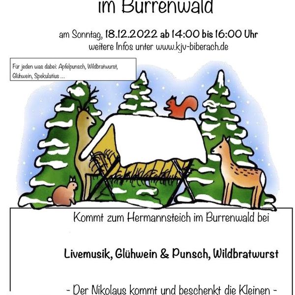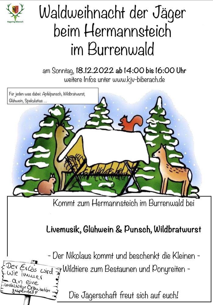 Nach zweijähriger Corona-Pause lädt der Hegering Biberach am 4. Advent (Sonntag, 18.12.2022) ab 14:00 Uhr bis 16:00 Uhr zur Waldweihnacht am Herrmannsteich im Burrenwald ein. In freier Natur, bei Glühwein, Kinderpunsch und Wildbratwurst soll kurz vor dem Weihnachtsfest wieder Ruhe einkehren. Eine Weihnachtsgeschichte wird erzählt, Weihnachtslieder erklingen und der Nikolaus kommt mit einem Schlitten zu den Kindern.