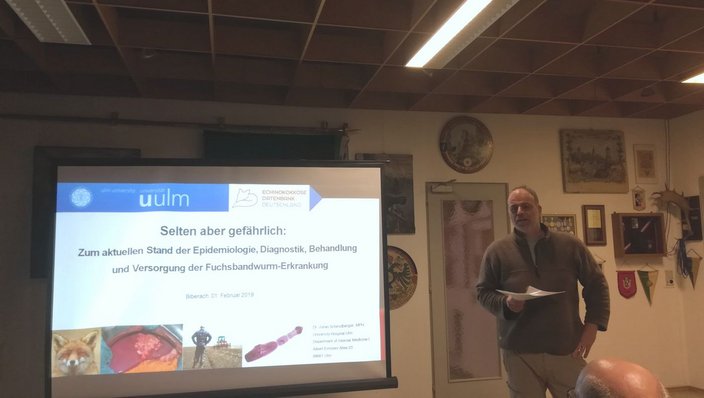 Die anschließende Fragerunde verdeutlichte das große Interesse und auch die Notwendigkeit der Forschung rund um das Thema Fuchsbandwurm. Auch wenn das Forschungszentrum an der Uni-Klinik in Ulm große Fortschritte macht, so gibt es noch viele offene Fragen, welcher sich Dr. Schmidberger und seine Kollegen jetzt und in der Zukunft annehmen wollen und werden.