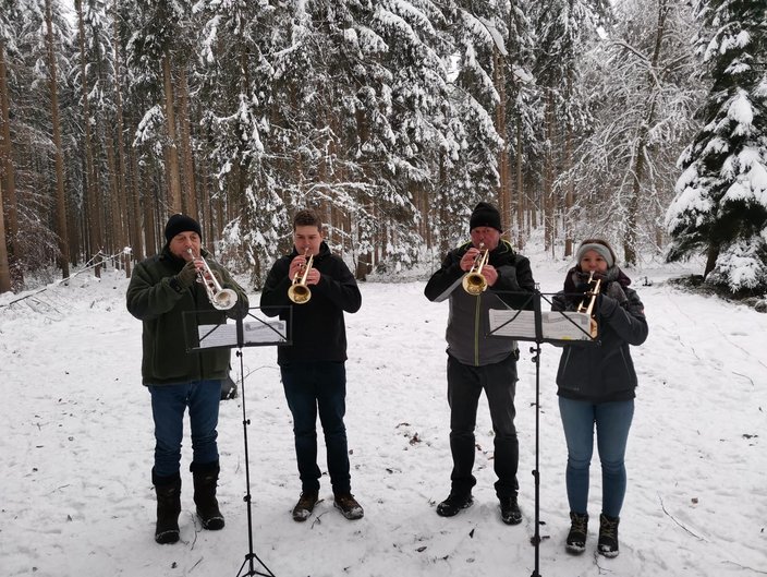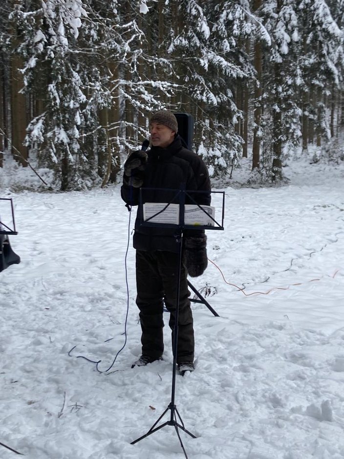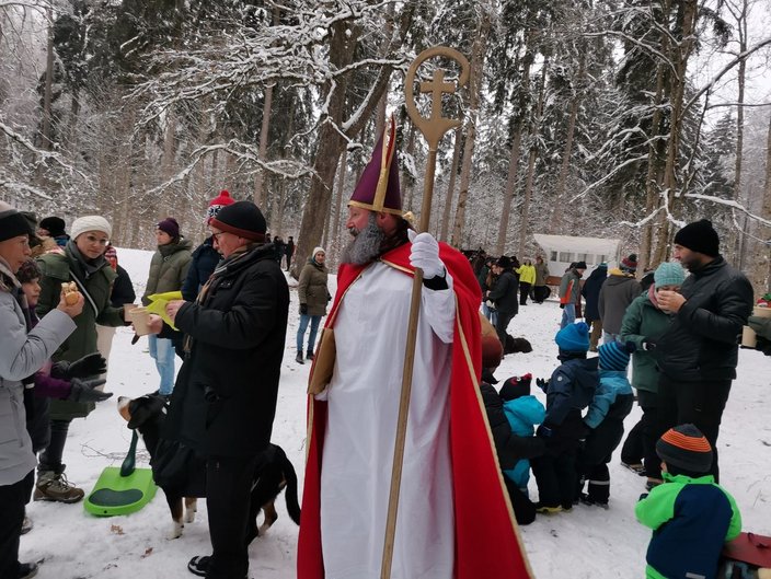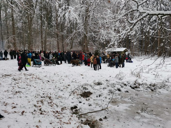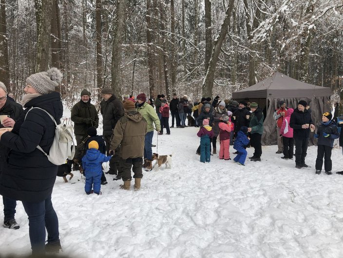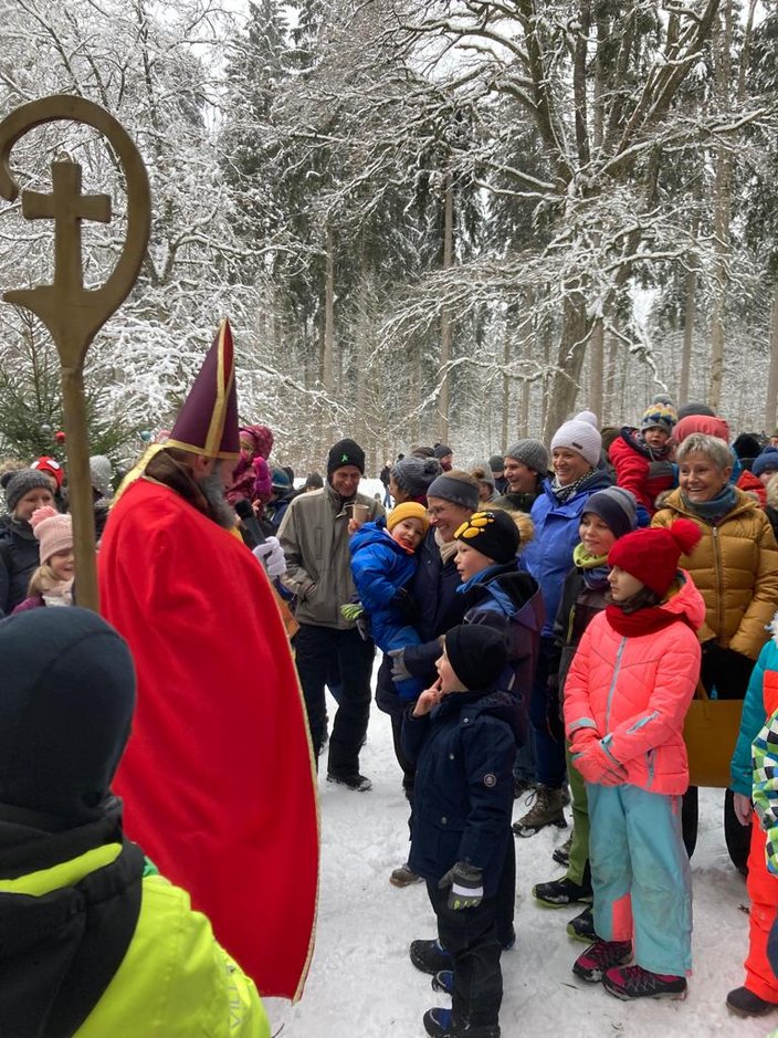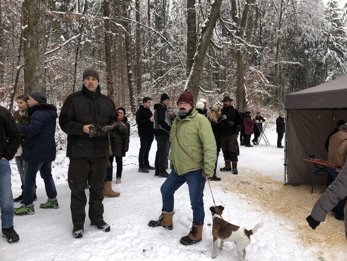 Trotz knackigen -7 Grad haben sich am 4. Advent (18. Dezember 2022) bei herrlichem Winterwetter viele Leute, darunter auch viele Familien mit Kindern, zur Waldweihnacht des Hegering Biberachs am Hermannsteich im Burrenwald aufgemacht. Nach einem jagdlichen Auftakt durch die Jagdhornbläser Biberachs ging es nach einem Grußwort durch Hegeringleiter Andreas Kübler mit stimmungsvoller Weihnachtsmusik durch ein Bläserensemble des Aittracher Musikvereins weiter. Die Anwesenden gesellten sich bei leckerem Glühwein und Punsch um die prasselnden Feuer oder Stehtische und genoßen die winterliche Atmosphäre. Zudem wurden die hervorragenden Wildbratwürste, die man frisch gegrillt oder auch als Rohwurst für Zuhause mitnehmen konnte, sehr gut angenommen. Am Ende blieb keine einzige der ca. 680 Würste übrig. Höhepunkt, vor allem für die kleinen Gäste, war die Ankunft des Nikolaus mit seinem Gehilfen Knecht Ruprecht, welcher in einer Pferdekutsche am Hermannsteich Station machte. Dort konnten die Kleinen mit dem Nikolaus in Kontakt kommen und wurden von ihm mit Lebkuchen beschenkt. Um 16 Uhr lichteten sich die Reihen und zurück blieb ein gutes Gefühl - endlich war wieder Waldweihnacht.