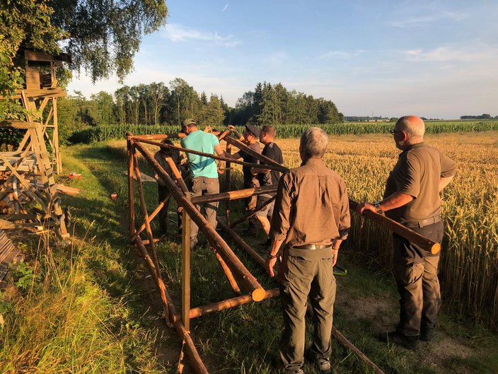 Hegeringsleiter Ernst Schöllhorn bot als Stammtischprogramm dieses Jahr einen Hochsitzbaukurs an. Er zeigte wie man aus einfachem Stangenholz sowie aus Lärchenkanthölzern einen Hochsitz baut. Dabei konnte er mit einigen Kniffen die Jäger verblüffen, wie ein Hochsitzbau theoretisch auch alleine möglich wäre. Alle Teilnehmer waren sich jedoch einig, dass Revierarbeiten in Gesellschaft mehr Freude bereiten.