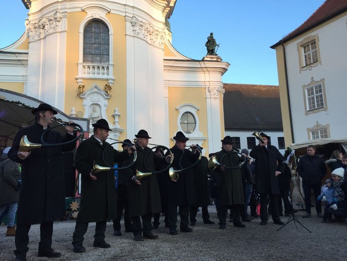 In barockem Ambiente, direkt vor der frisch erhobenen Basilika Minor, erfreuten die Jagdhornbläser wieder die Besucher des Weihnachtsmarktes mit jagdlichen Klängen. Mit kurzen Erklärungen wurden die Hintergründe und Traditionen der einzelen Signale erläutert. Anschließend gab es bei einer leckeren Rehbrühwurst der Ochsenhausener Jäger noch die Möglichkeit sich mit den Jagdhornbläsern auszutauschen.