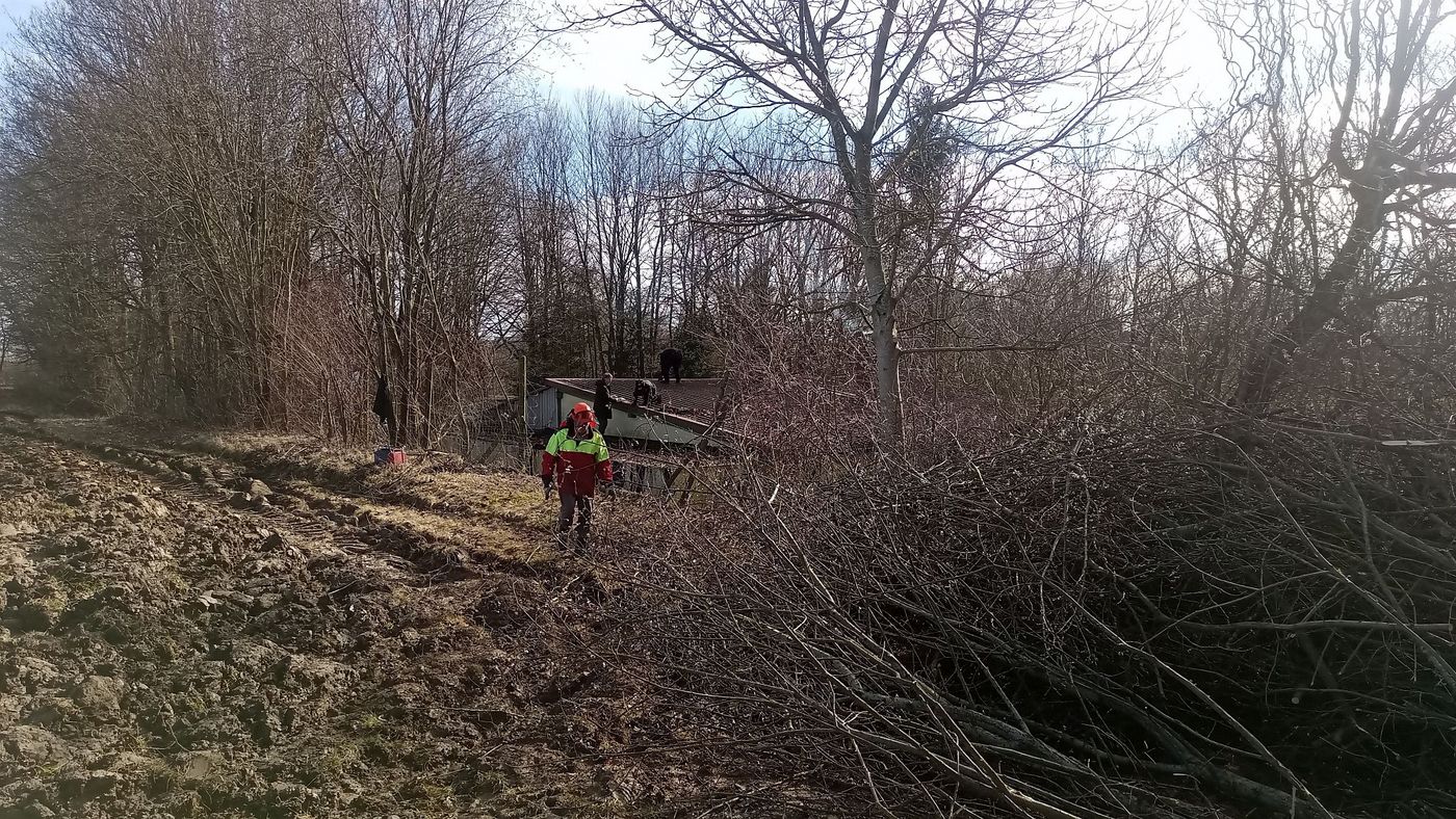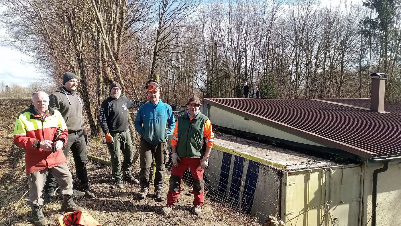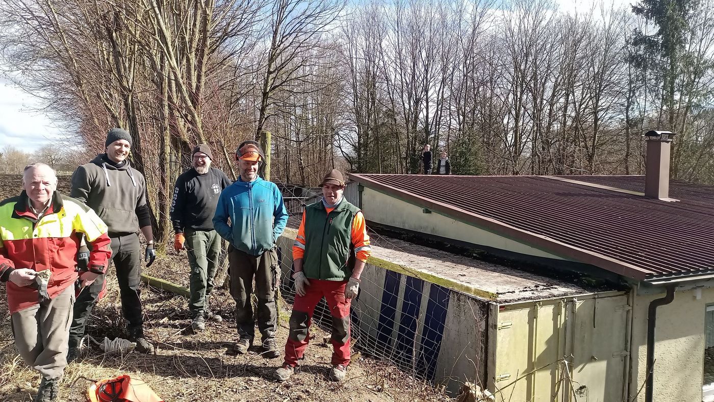 Ferner konnte auf den Schießständen, dem Parkplatz und dem Pavillonsbereich das komplette Laub entfernt werden. - Am Samstag 24.02.2024 wurden dann die Dächer und die Dachrinnen vom Laub befreit. Zudem wurde der komplette Hang-Containerbereich vom Gehölz frei geschnitten.